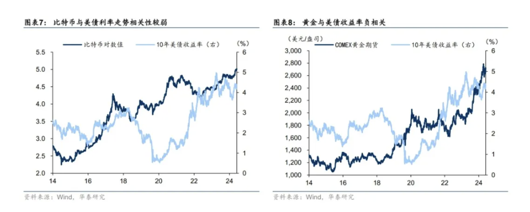 第四、从金融属性来看,黄金和比特币对美债利率及美元指数的敏感度存在差异,比特币与美债利率相关性较黄金更弱。在考虑到央行购金的影响后,黄金与实际美债利率保持了较高且稳定的负相关性。相比之下,比特币与美债利率相关性并不显著,甚至存在较长时间正相关关系,比如2016-2017年、2020-2021年、以及2023年,均出现美债利率与比特币同步走高的情形。