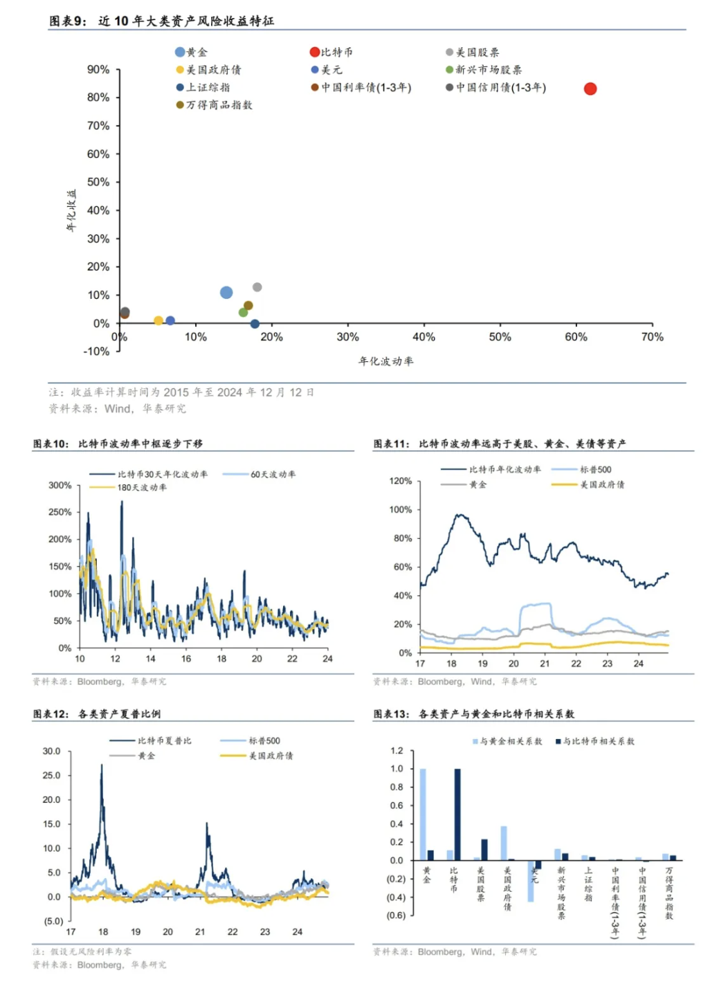 从定价逻辑看,黄金与比特币都具备类货币属性,受益于地缘冲突+发达国家债务可持续性担忧等长期问题,不过两者也存在定价逻辑的差异;比特币的供给约束比黄金看似更为严格;从风险偏好来看,比特币多数时期其实是risk on资产,黄金则是risk off资产;从货币属性来看,黄金作为货币有着悠长的历史,而比特币的货币属性需要更多政府部门的背书和时间的验证;从金融属性来看,比特币与美债利率相关性较黄金更弱;比特币具备“高收益+高风险+高夏普+低相关”的收益特征;从持有结构看,新兴市场国家持续购金,而发达国家对比特币接受度更高。