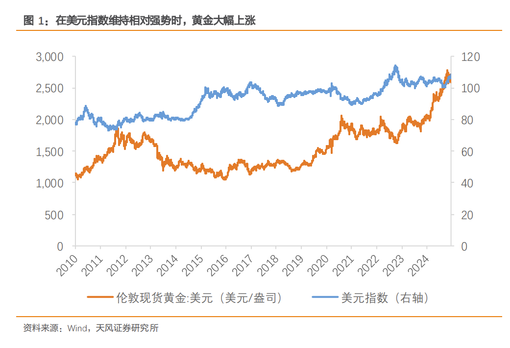 自2022年以来,黄金与美元出现了同步走强的现象。如果通常认为美元强势会导致黄金弱势,或者反之,则需要解释为何美元与黄金同时走强成为了2022年之后的一个显著趋势。