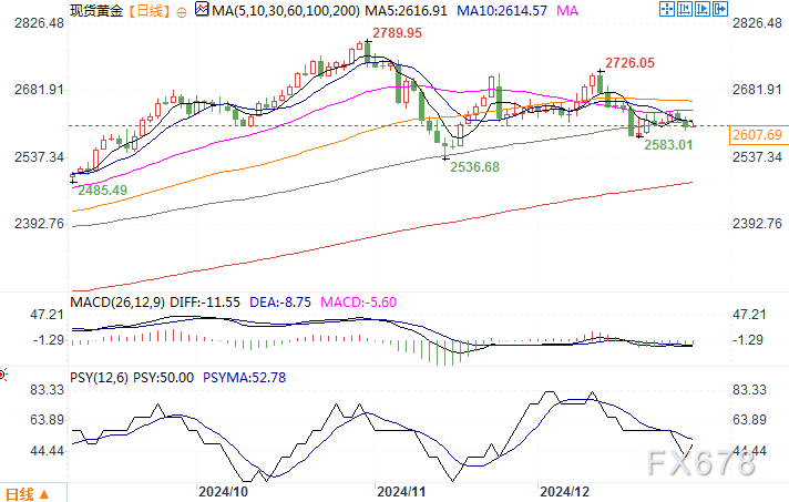 现货黄金日线图来源:易汇通北京时间12月31日13:22 现货黄金 报 2607.69 美元/盎司