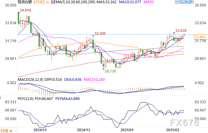 现货白银日线图 来源:易汇通北京时间2月14日11:10 现货白银 报 32.462 美元/盎司