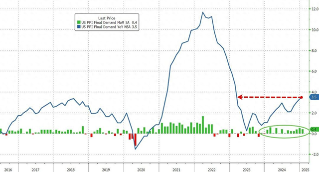 具体来看,美国1月PPI年率录得3.5%,为2023年2月以来最大增幅,市场预期为3.2%。美国1月PPI月率录得0.4%,市场预期为0.3%。