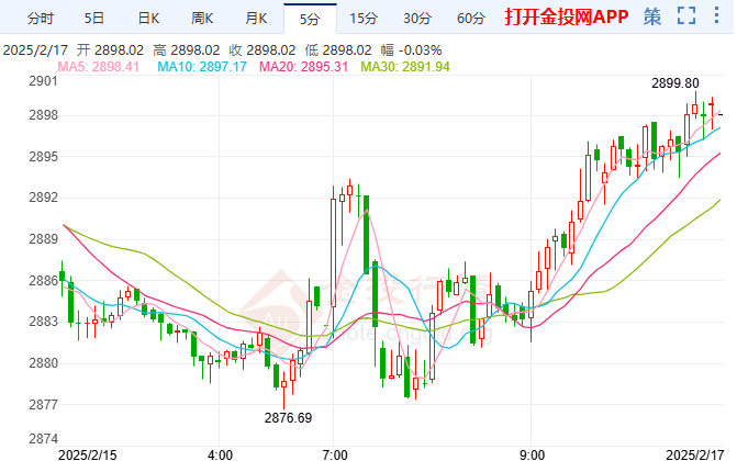 周一(2月17日)亚市盘中,现货黄金短线剧烈波动,今日金价开盘后反弹走高,遇阻回撤一度跌破2880美元/盎司,随后回升至2900附近,黄金近期仍技术性超买,日线图上的相对强弱指数(RSI)维持在80附近。