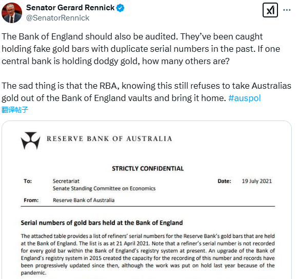 Rennick表示,“英国央行也应该接受审计。他们过去就曾被发现持有带有重复序列号的假金条。如果一家中央银行持有伪造黄金,还有多少其他中央银行持有伪造黄金?可悲的是,澳洲联储明知这一点,却仍然拒绝将澳大利亚的黄金从英国央行金库中取出并带回家。”