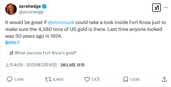而颇有意思的是,围绕该话题而形成的一个大胆猜测,如今似乎也引发了掌舵美国“政府效率部”的马斯克本人的兴趣,那就是是否该查查美国最主要的黄金储备存放地——诺克斯堡金库里的黄金?