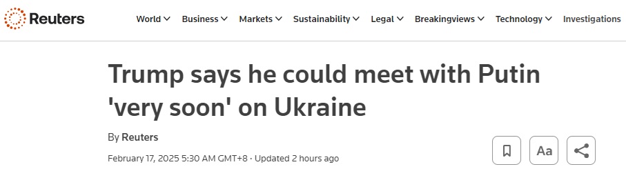 当地时间周日(2月16日),美国总统特朗普(Donald Trump)在佛罗里达州棕榈滩国际机场向记者表示,他将“很快”与俄罗斯总统普京(Vladimir Putin)会面,讨论结束乌克兰战争的问题。