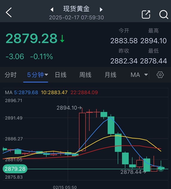 24K99讯 周一(2月17日)亚市盘初,现货黄金价格剧烈波动。金价在开盘后升至2894.10美元/盎司,但金价短线突然大幅下滑,金价刚刚跌破2880美元/盎司,最低触及2878.44美元/盎司。