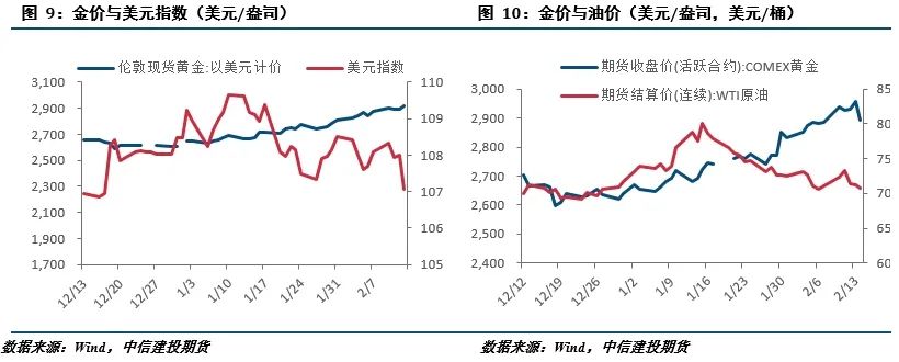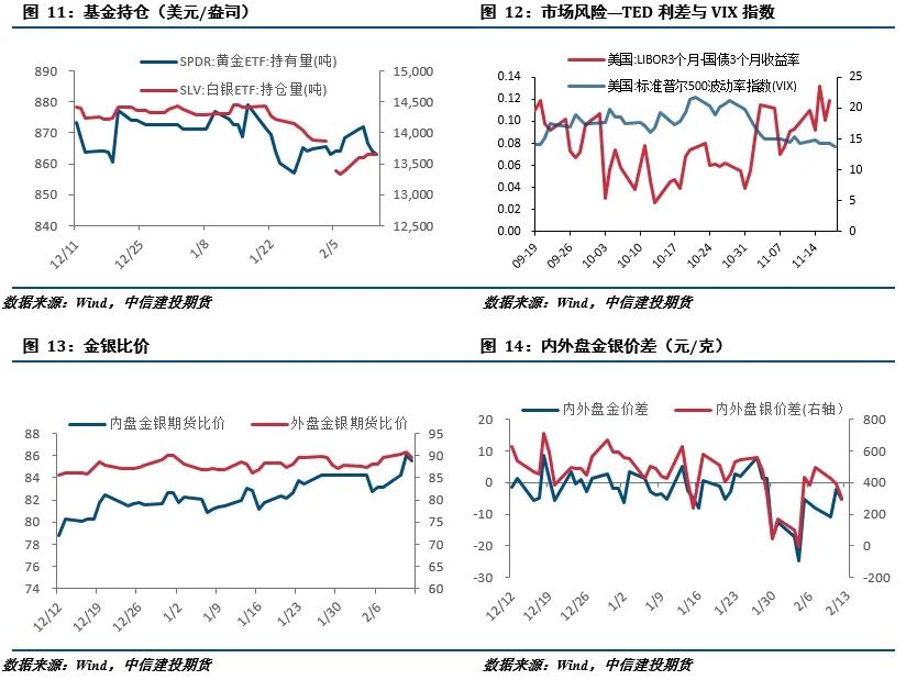 截止2025年2月14日,SPDR 黄金 ETF 持有量为863.06吨,较上周减少5.44吨,截止2025年2月11日,COMEX 黄金非商业多头净持仓为284504张,较上周减少18004张。