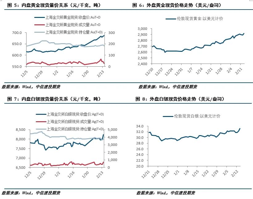 特朗普政策扰动持续,其主张的关税政策正逐步落地,推升了通胀担忧,并且还给俄乌冲突及巴以冲突带来地缘政治的不确定性。美国1月通胀超预期,美联储官员态度持续谨慎,市场预期美联储或持续暂停降息。欧元区经济数据仍显低迷,欧央行官员维持鸽派。总体来看,特朗普政策继续扰动市场,对其政策带来的地缘政治不确定性以及通胀的不确定性,成为贵金属市场的主线交易逻辑,不过,在市场逐渐适应其节奏后,上涨动能或将逐渐减弱。