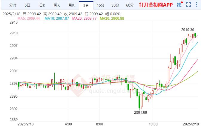 本交易日(2月18日)亚盘时段,国际黄金短线企稳上涨,目前交投于2909.57美元/盎司,涨幅0.41%。本周,美国经济将有更多的美联储讲话、住房数据、最新的联邦公开市场委员会会议纪要、初请失业金人数以及标准普尔全球2月份PMI预览值终值。
