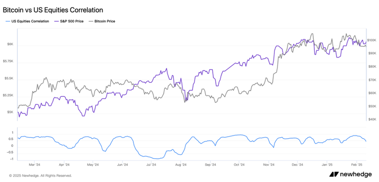 比特币与标普 500 指数的相关性呈现出较为温和的正相关特征,相关系数多数时候维持在 0 到 0.5 之间,比特币涨幅显著大于 S&P 500,价格协同性在高点区域较为清晰。这种关系在 2024 年后期表现得尤为明显,当时随着美联储转向鸽派立场的预期升温,风险资产普遍获得提振。