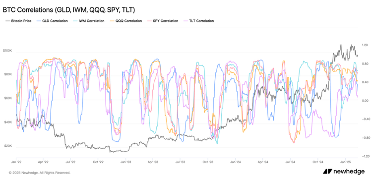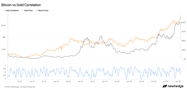 黄金作为传统避险资产,与比特币的关系相对复杂。从长期数据来看,比特币与黄金的相关性表现出明显的不稳定性,频繁在正负区间波动,早期二者的相关系数多呈负相关,彼时比特币被视为黄金的‘数字替代品’。但 2022 年后的市场动荡中,二者多次出现同步行情。2024 年后期相关性趋于正值,但波动仍然明显。