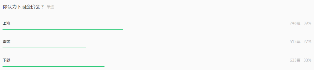 2月10日当周,伦敦金价格开盘2861.38美元/盎司,最高2942.62美元/盎司,最低2860.1美元/盎司,收盘2882.81美元/盎司。北京黄金经济发展研究中心调查显示,市场人士认为本周国际金价震荡可能性较大。投票显示,有39%的读者看涨本周金价、27%看震荡、33%看空。