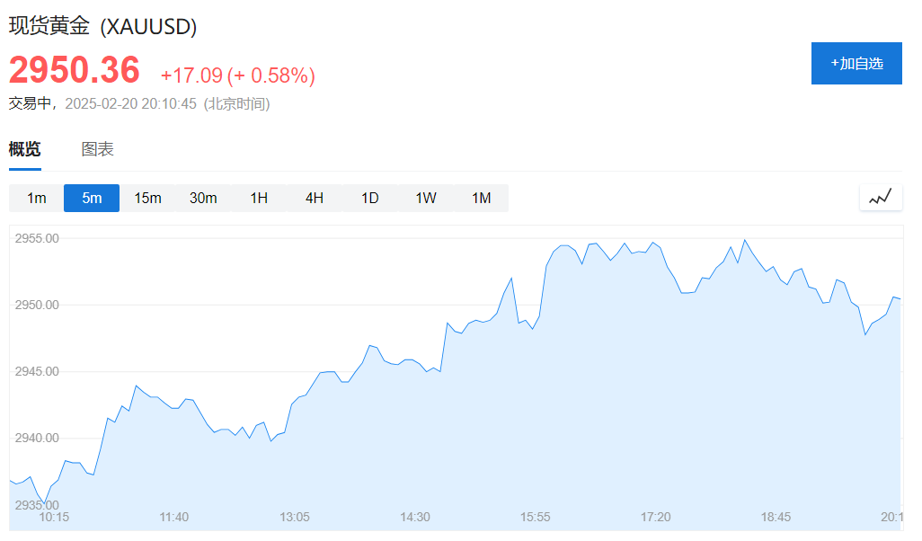 2月19日周四,现货黄金盘中一度触及2954.69美元,这是今年以来黄金价格第十次刷新纪录,现报2950.36。同时,美国黄金期货价格也上涨1.2%至2970.7美元/盎司。