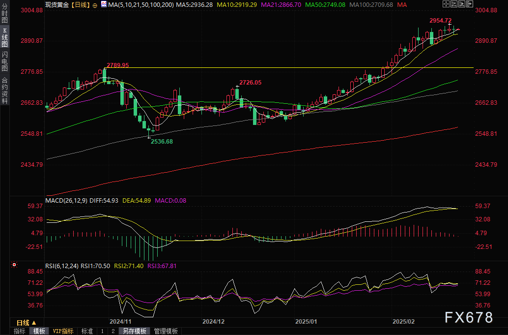 “黄金在2月20日触及接近2,955美元的历史高点。然而,从技术上看,它开始显得容易受到挫折。今年(现货)超过13%的涨幅可能会引发‘价格冲击’并减缓购买。动量指标并未确认历史高点,警告‘看跌背离’。”