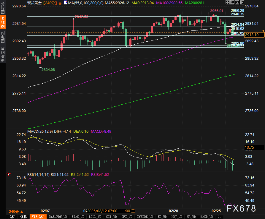 周三(2月26日),现货黄金(XAU/USD)在近期经历了较大幅度的下跌后,当前稳步在2910美元附近整理。周二黄金价格一度下跌超过1.3%,主要受美国消费者信心指数疲软和特朗普政府加强关税威胁的影响。尽管如此,黄金市场依然受到市场对美联储可能降息的预期支撑,短期内黄金价格或有企稳迹象。