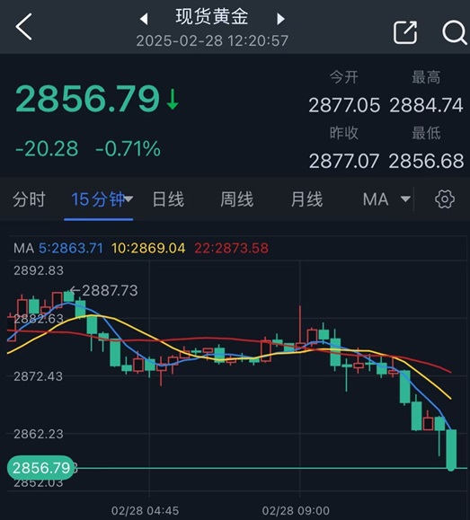 北京时间12:20,现货黄金报2856.79美元/盎司。