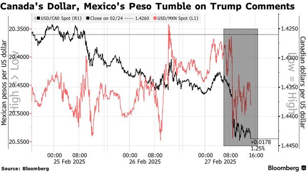 自特朗普重返白宫以来,墨西哥比索一直受到关税新闻的冲击,在他周四发表讲话后,比索最初下跌0.6%。