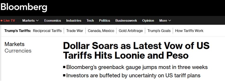 FX168财经报社(亚太)讯 周四(2月27日)美元指数飙升,美国彭博社称,在美国总统特朗普(Donald Trump)确认下周将对加拿大和墨西哥征收25%的关税后,货币交易员买入美元,加元和墨西哥比索遭到打击,而现货黄金周四收盘暴跌近40美元。
