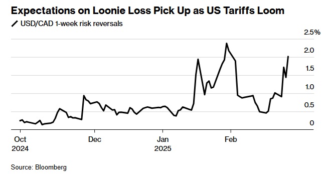 特朗普做出关税声明后,一项衡量加元近期贬值预期的指标周四飙升,并且有望创下2月份对加元最悲观的收盘价。期权市场也开始出现更大波动。