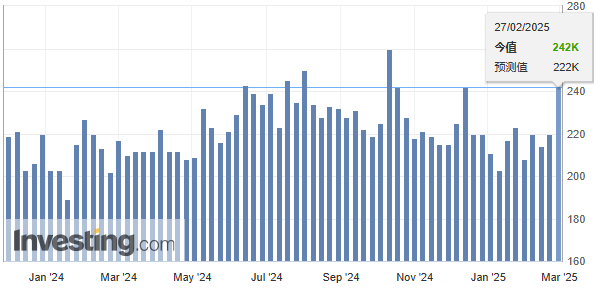 具体数据显示,截至2月22日一周,首次申请失业救济人数环比增加2.2万至24.2万人,为去年10月份以来的最高水平,市场原来平均预期只会微涨至22.1万人。