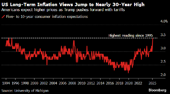 当消费者预期价格会上涨时,涨价会更容易,几项调查表明在特朗普推进关税之际,消费者和企业最关心的就是这一点。根据密歇根州大学数据,着眼未来五到十年的长期通胀预期在2月升至1995年以来最高水平。对未来一年的预期也有所上升,这拖累了该大学和世界大型企业联合会的信心指数。