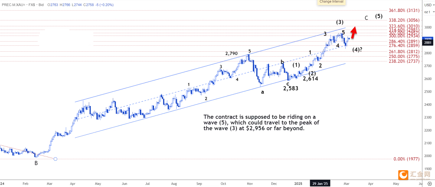 在日线图上,该合约应该处于波浪 (5) 上,可能会达到波浪 (3) 的顶峰 2956 美元或更高的位置。