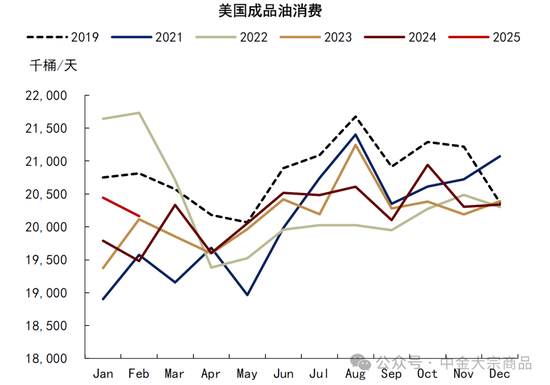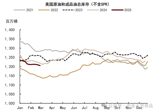 此外,与宏观数据有所不同,年初以来OECD国家的成品油消费表现好于我们预期。据IEA数据,1月OECD成品油消费同比增加约1%,其中美国成品油消费同比增加约3.3%、为主要增量来源。EIA高频数据显示,2月美国成品油消费同比增速继续录得3.5%的较高水平。最近几周美国商业原油库存上升或受到炼厂开工暂未恢复的阶段性影响,表现为商业原油与成品油库存总量符合季节性走势,我们认为石油现货市场供需紧平衡或并未改变。OPEC+增产情形下,我们测算今年全球石油市场供应过剩压力或约为28.7万桶/天。