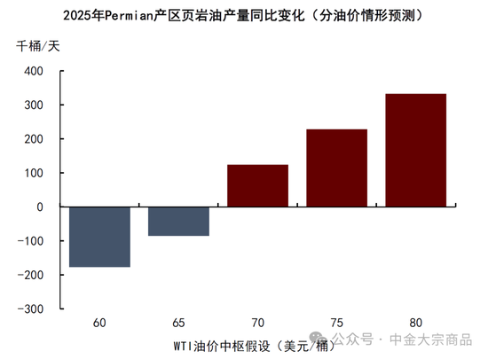 但我们也提示,OPEC+在今年的增产空间较为有限(全年同比+22.5万桶/天);并且与宏观数据有所不同,1-2月美国成品油消费表现稳健且好于市场预期,或主导OECD成品油消费在1Q25同比增加约1%,原油库存也延续偏低路径,我们认为全球石油现货市场紧平衡格局暂未改变,OPEC+增产下,全年供应过剩压力约为28.7万桶/天。油价中枢下移之后,作为边际生产者的北美页岩油或迎来初步考验,若WTI油价中枢下移至60-65美元/桶,我们预期Permian页岩油产量的下滑压力最早或从2025年中开始显现,可能为油价提供底部支撑。