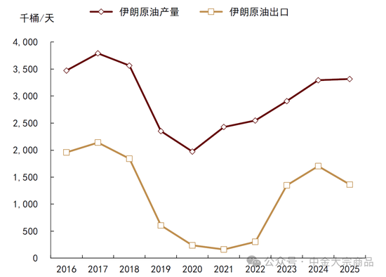 俄乌和谈预期下,俄罗斯原油供应的实际恢复空间或较为有限。产量方面,2024年俄罗斯原油产量为1034.5万桶/天,较2021年减少17.8万桶/天,且处于OPEC+产量协议约束之下。如上文测算,即使OPEC+从4月开始逐步增产,我们认为今年俄罗斯或基本没有剩余配额。出口方面,2021至2024年,俄罗斯对欧洲(约为200万桶/天)、美国(约为19万桶/天)的原油出口减量,基本被去往印度(约为142万桶/天)、中国(55万桶/天)的出口增量抵消,净减量约为47万桶/天。我们预期若欧美放松对俄石油出口约束,出口恢复空间可能同时受制于产量约束和贸易流向调整,理论出口增量或约为50万桶/天。此外,近期美国政府重拾对伊朗石油行业的制裁举措[3]。回顾特朗普第一任期内,伊朗原油产量在2018和2019年分别同比下降23万桶/天和121万桶/天。2024年伊朗原油产量已回升至329万桶/天,较2019年增加约94万桶/天;原油出口恢复至170万桶/天,较2019年增加约110万桶/天。如果伊朗供应的潜在减量兑现,我们认为或能够缓解今明两年的全球石油供应过剩压力,在此情形下,布伦特油价中枢或有望保持在70美元/桶上方。据彭博数据,今年1-2月伊朗原油出口已初步下降至136万桶/天。