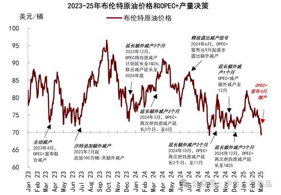 近期布伦特油价一度跌破70美元/桶,为去年9月以来首次。与1月中旬油价高于80美元/桶时相比,原油期货近月升水收窄贡献约七成价格跌幅,显示现货基本面趋松担忧为近期油价回落主因。我们认为2月以来美国宏观经济数据走弱和OPEC+从4月开启增产周期或主导市场情绪调整,叠加特朗普政府推进美、俄谈判,俄罗斯石油供应恢复预期有所升温,也对地缘风险溢价形成压制。在美国关税政策反复和全球贸易摩擦风险较高的背景下,OPEC+的增产决策并不符合其效用最大化和维系财政盈余平衡的内生诉求,我们认为可能受到外生因素的超预期扰动,并为石油市场带来短期抛售压力,布伦特油价波动区间或阶段性下移至65-70美元/桶。