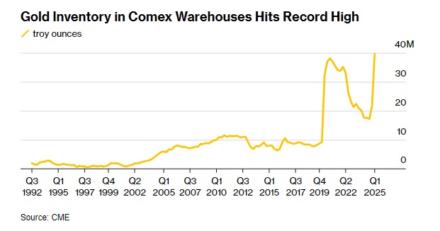 纽约商品交易所(Comex)黄金库存周三达到3970万盎司,创下了1992年有纪录以来的最高水平,总价值约1150亿美元。