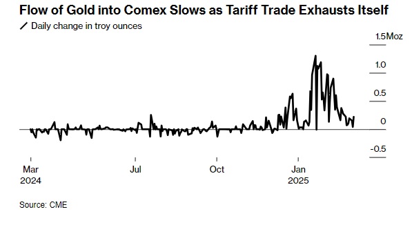 每日流入Comex金库的黄金量已从1月底的峰值100多万盎司,降至过去一周左右的约20万盎司或更少。