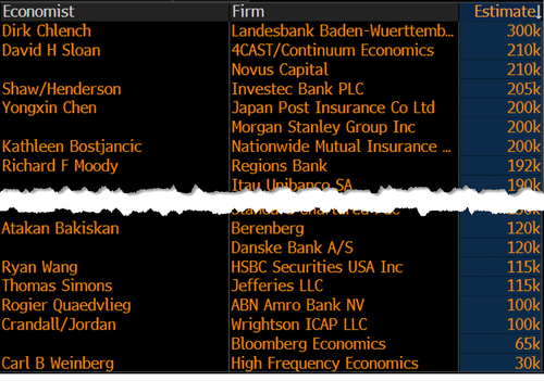 从对业内机构的预测样本统计来看,今晚非农数据究竟是好是坏,似乎是颇为难以判断的——因为业内机构的预测数字差异极大,最高的预测达到了30万人,而最低的预测只有可怜的3万人,上下限之间相隔了整整10倍。