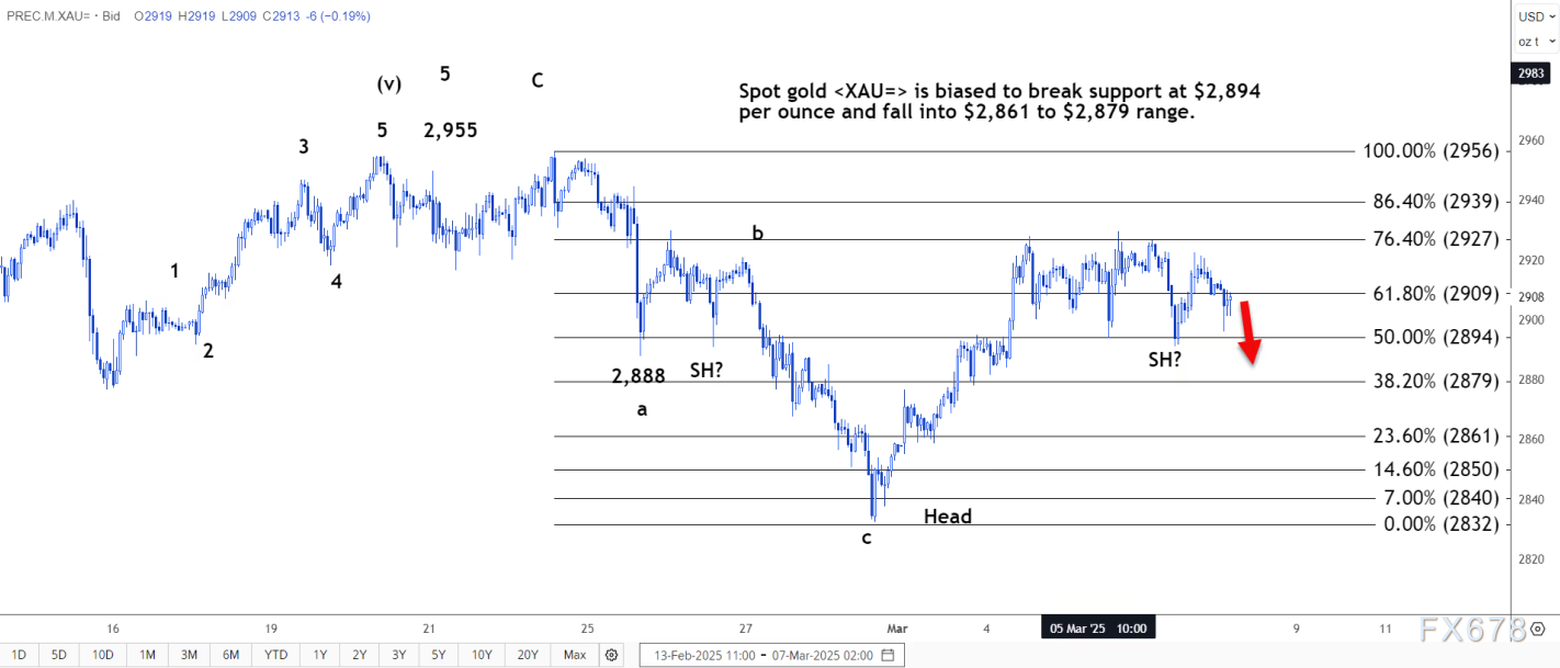 路透技术分析师指出,现货黄金有望跌破每盎司 2894 美元的支撑位,跌至2861美元至2879美元的区间。