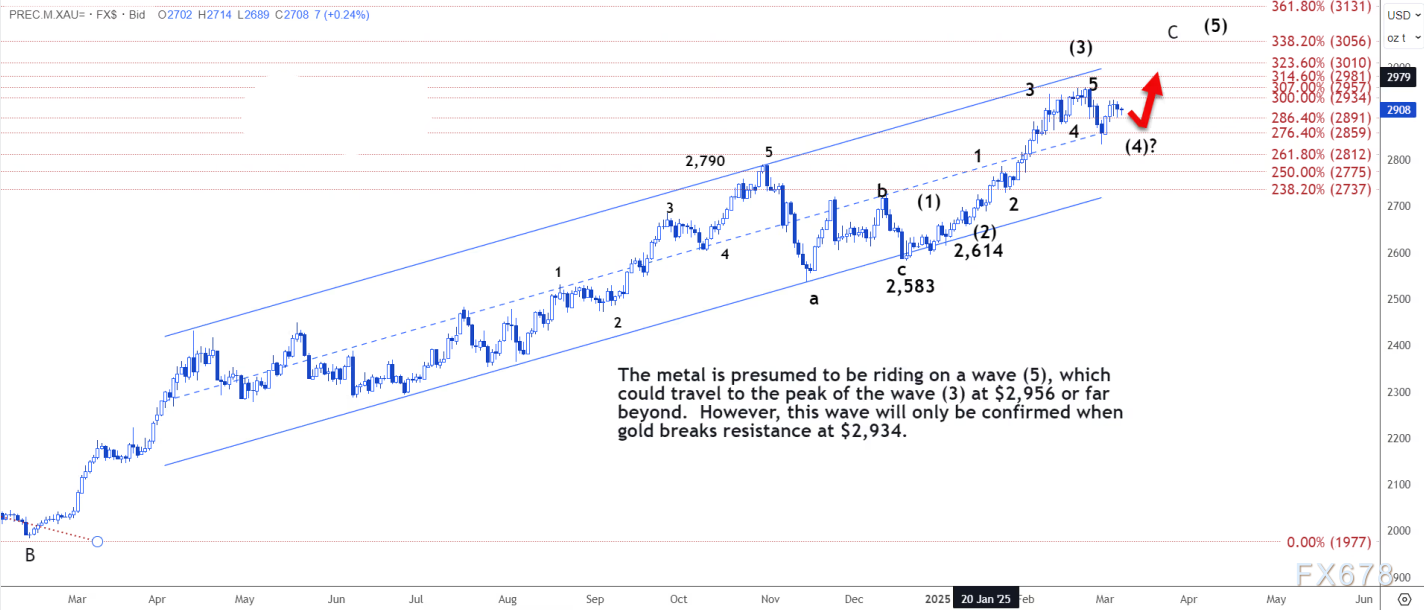 如果向上突破 2927 美元将确认倒置头肩形态,并延续上涨趋势,迈向 2 月 25 日的高点 2956 美元。