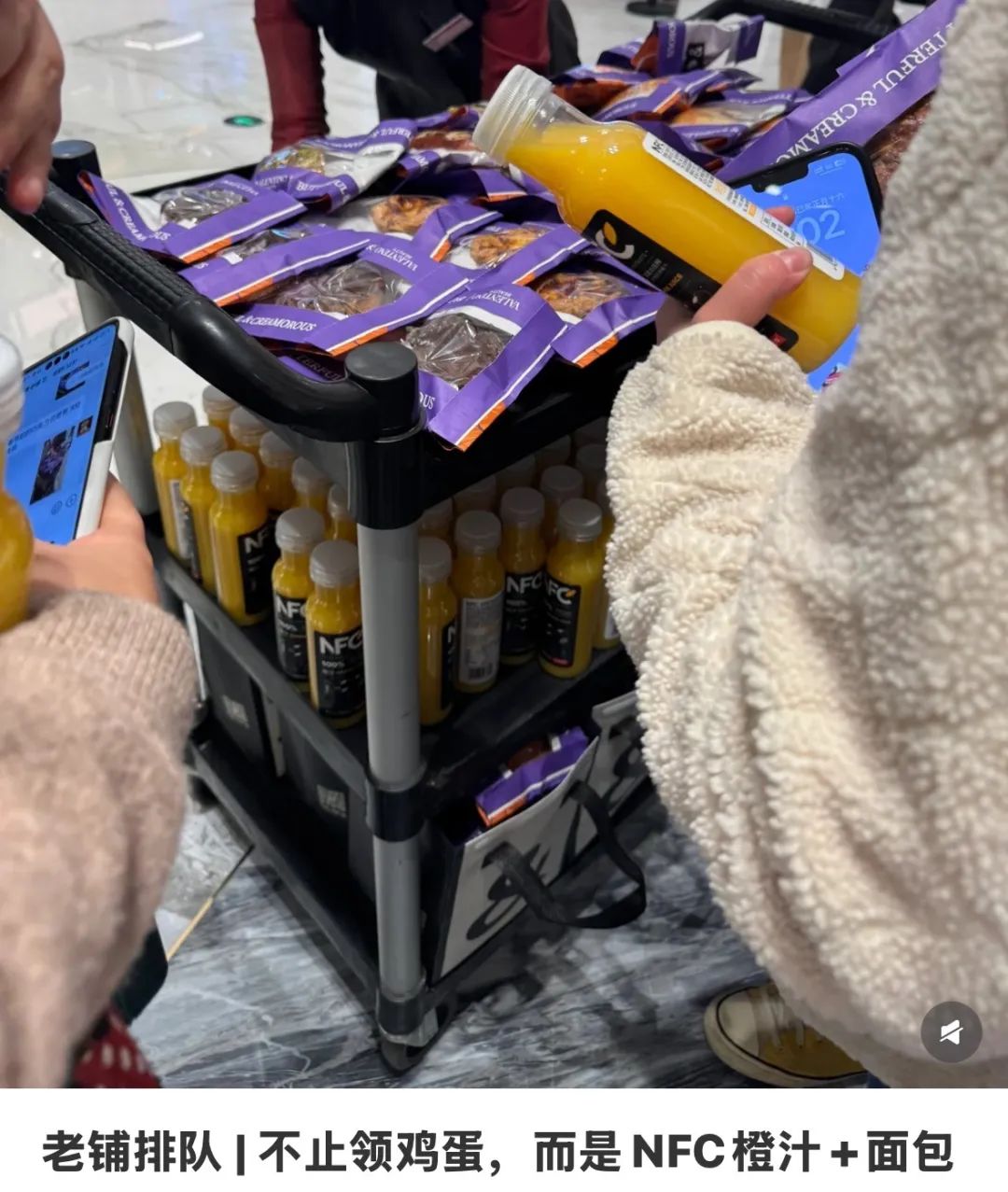 “每天中午都会给排队的顾客发放盒饭,两荤两素营养均衡;下午茶时间专门请了男模,来回走动给大家派发Godiva的巧克力。发的水是十几块一瓶的依云,橙汁是NFC的,就连充饥的小面包,也是从手工烘焙精品店买来的。”