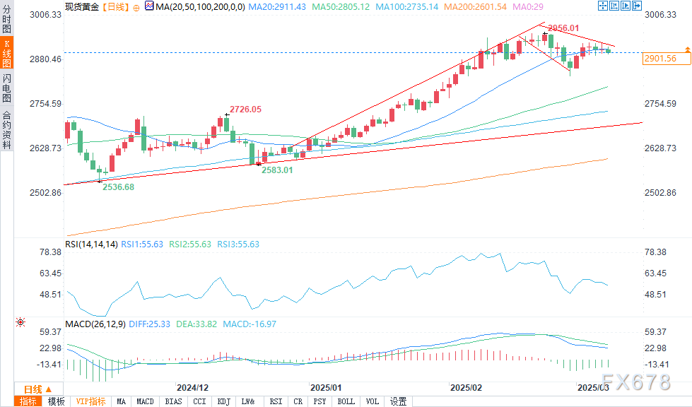 若金价跌破2900美元,并不一定预示着特别明显的看跌趋势,这可能表明市场仍在评估自身是否具备足够动力继续上行。50日指数移动平均线位于看涨旗形底部,接近2875美元水平,为该蜡烛图形态的支撑位增添了新的考量维度。