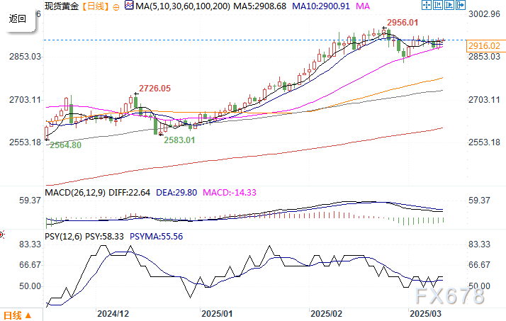 现货黄金日线图 来源:易汇通北京时间3月12日11:05 现货黄金 报 2918.12 美元/盎司