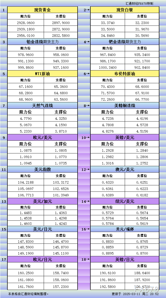 XM官网:3月11日美市更新支撑阻力:18品种支撑阻力(金银铂钯原油天然气铜及十大货币对)