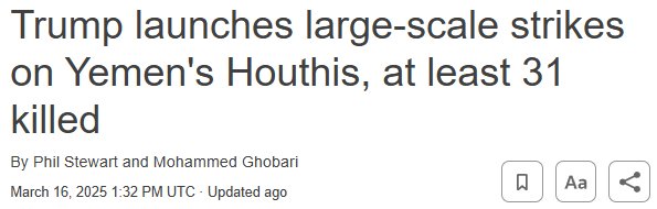 路透社报道,特朗普周六对也门与伊朗结盟的胡塞武装发动了大规模军事打击,以抗议该组织袭击红海航运,造成至少31人死亡,预计此次行动将持续数日。