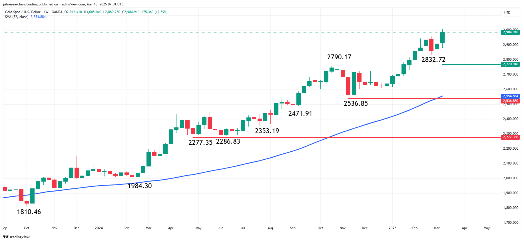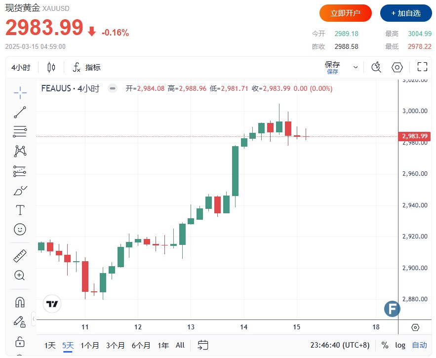 24K99讯 黄金本周收报2983美元,周间一度触及3004美元高点。美国总统特朗普周末无预警展开特朗普上任以来美国在中东最大规模军事行动,向胡塞武装组织发动袭击。特朗普要求停止攻击红海航运,否则“地狱之雨”将降临到他们头上,并警告伊朗停止对该组织的支持。分析师展望,黄金下周能否重新突破3000美元,将取决于美联储会议。