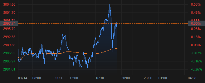 具体行情显示,现货金价于15:00跌至日内低位2980.93美元,自此开始明显拉升,之后的三个小时内累涨超30美元,最高时报每盎司3005.00美元。现从高位回落了7美元,报每盎司2997.75美元。