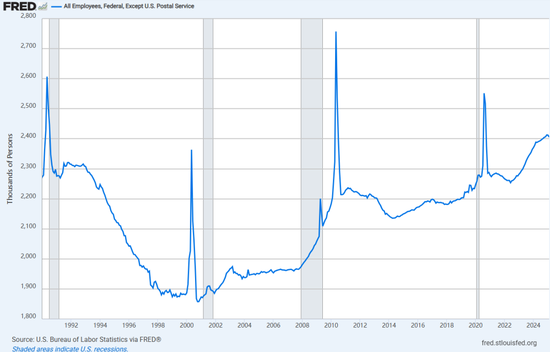 当前联邦雇员(除邮政服务)人数在240万人(见图5),平均薪资在11万美元一年,如果DOGE削减5%-10%的联邦劳动力,则每年能节省上百亿美元的薪资支出,以达到节省联邦政府机构预算的目的。