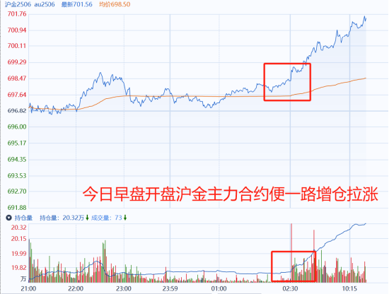 国内市场,沪金Au2506主力合约,整体呈现增仓拉涨格局,从分时图上可以清晰看出,持仓量自今晨开盘于698.3附近便猛然拐头向上,一鼓作气向上进攻,同步突破700整数大关,后续关注今日收盘状态,若能稳住700整数关口,后续或将以700为强阻力位继续震荡偏强运行。