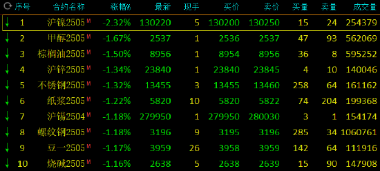 早盘收盘,国内期货主力合约涨跌不一。集运欧线、白糖涨超1%,20号胶、玻璃、丁二烯橡胶、SC原油、燃料油、沪金涨近1%;跌幅方面,沪镍跌超2%,甲醇、棕榈油、沪锌、烧碱、螺纹钢、纸浆、沪锡跌超1%。