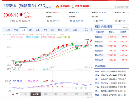 3月18日,受中东局势影响叠加美国疲软经济数据,金价再创新高。截至发稿时,现货黄金最高价报3008.32美元/盎司。