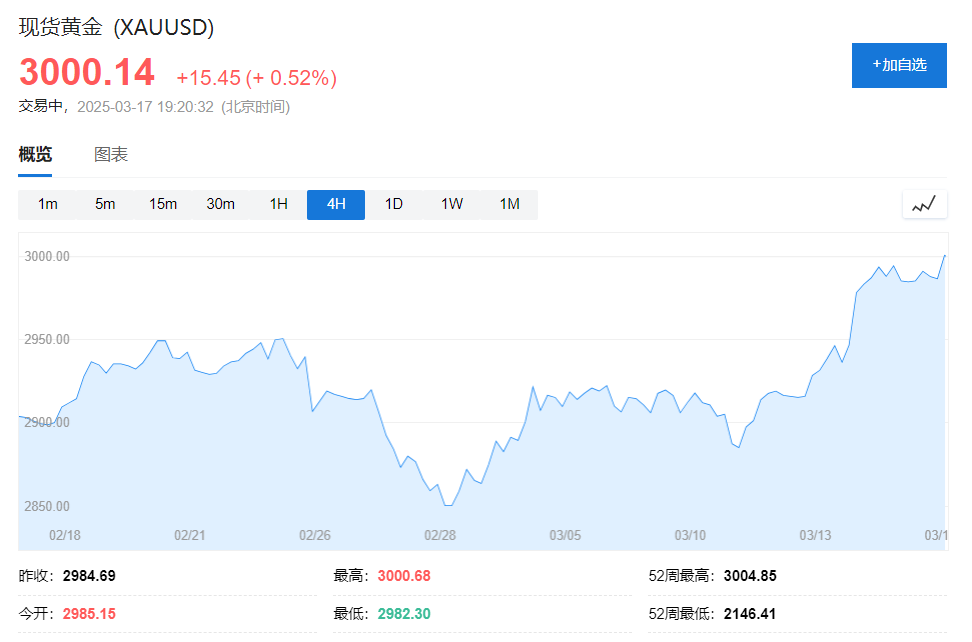 现货黄金已于上周五首次突破3000美元/盎司关键心理门槛,这一历史性突破标志着市场对避险资产需求的显著增加。小幅回落后,现货黄金今日日内涨逾0.5%,再次站上3000美元大关。