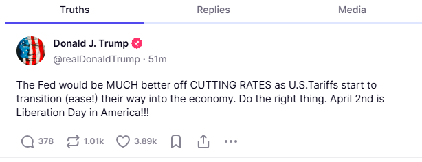 值得一提的是,特朗普在最新社媒帖子还补充称,4月2日——他即将公布提高贸易关税计划的日期,将是美国的“解放日”。