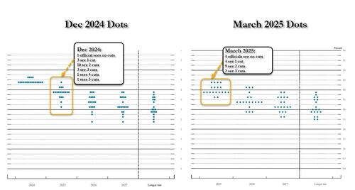 点阵图:鹰派美联储3月点阵图继续预计2025年将降息两次。但正如我们前瞻中援引高盛报告提到的,年内利率的具体点阵分布出现了上移。19位官员中如今有多达4位认为2025年不会降息,4位预计将降息一次,9位预计将降息两次,2位预计将降息三次。